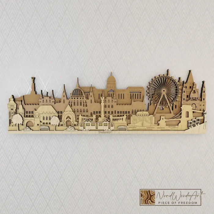 A Budapest városkép lenyűgöző, többrétegű fa fali dekoráció, amely a magyar főváros monumentális látképét hozza el otthonodba. Ez a kézműves kivitelezésű fa művészeti darab a Parlament, a Lánchíd és a Budai Vár csodálatos részleteit jeleníti meg modern, minimalista stílusban.